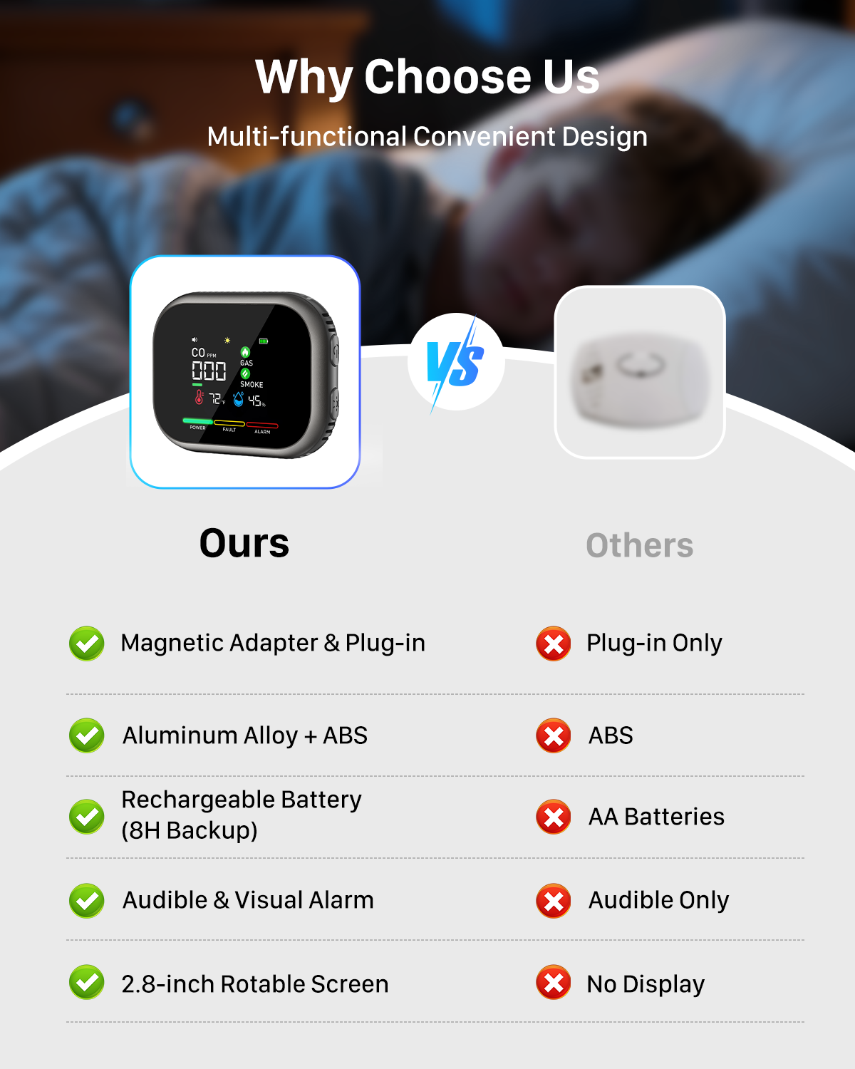 - Dual Power Supply with Magnetic Base for Easy Portability: Enjoy versatile placement options with our portable gas and CO detector. Use it plugged into an AC outlet, or detach and attach to the magnetic base for cord-free monitoring. The built-in rechargeable battery provides seamless power switching, making it perfect for RVs, camping, cabins, and mobile use.
